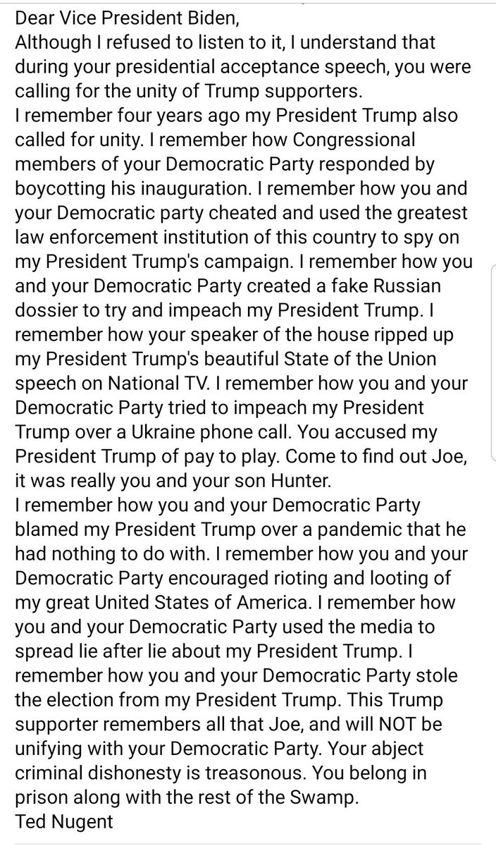 Dear Vice President Biden Although I refused to listen to it I understand that during your presidential acceptance speech you were calling for the unity of. Dear Vice President Biden Although I refused to listen to it I understand that during your presidential acceptance speech you were calling for the unity of Trump supporters. Ted Nugent wrote a letter to Biden.